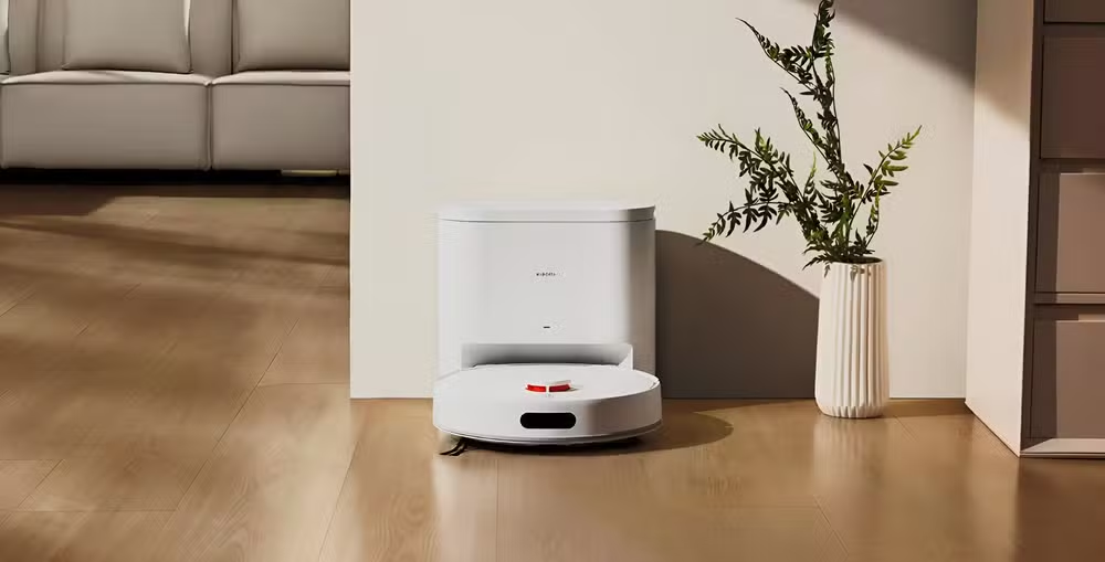 A base de coleta automática é um dos destaques do design. Com apenas 16 cm de profundidade, ela é descrita pela Xiaomi como “compacta” e projetada para se integrar facilmente a qualquer decoração, ocupando muito menos espaço que concorrentes. A base de carregamento combina com a cor branca do robô. Ela possui um duto de sucção potente, que esvazia o reservatório interno do robô automaticamente após a limpeza, enviando a sujeira para o saco de 4 litros em seu interior.